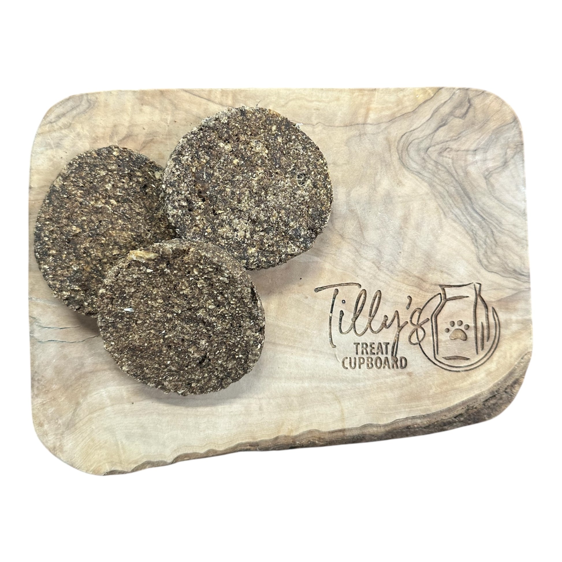 Treat your furry friend to Monty's delicious Venison with Blackberry Cookies! Made with high-quality venison and real blackberries, these all-natural treats are a healthy and flavourful snack for your pet containing over 85% venison meat. Perfect for dogs with sensitive stomachs or allergies, these cookies are sure to be a hit with your four-legged companion.