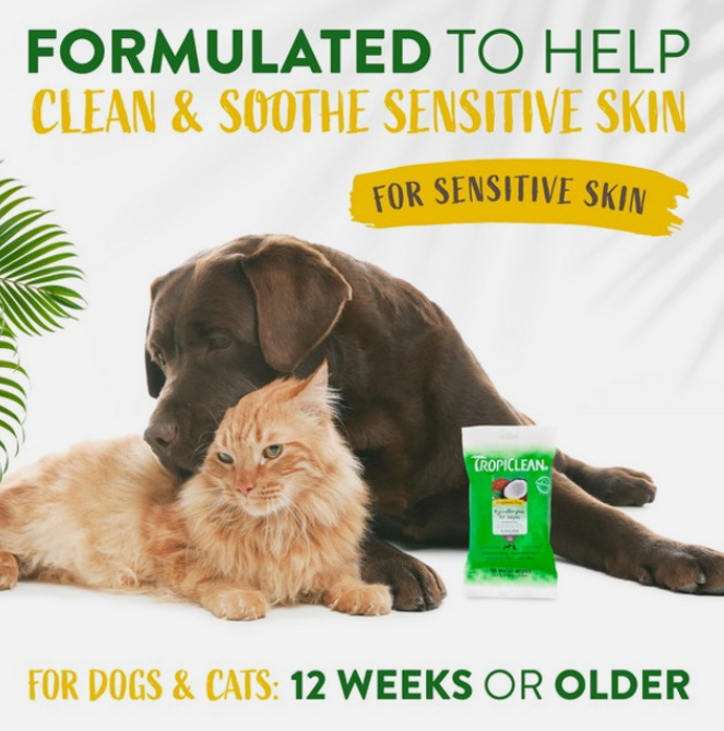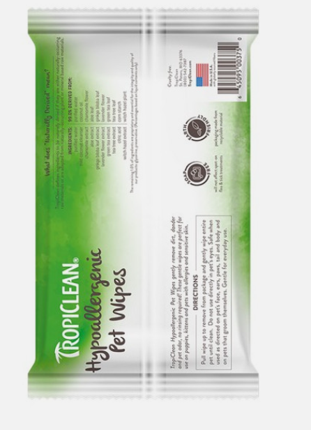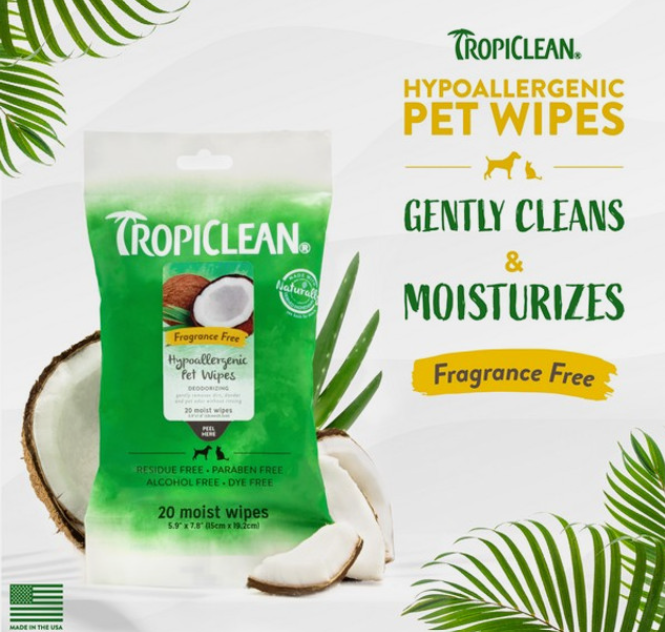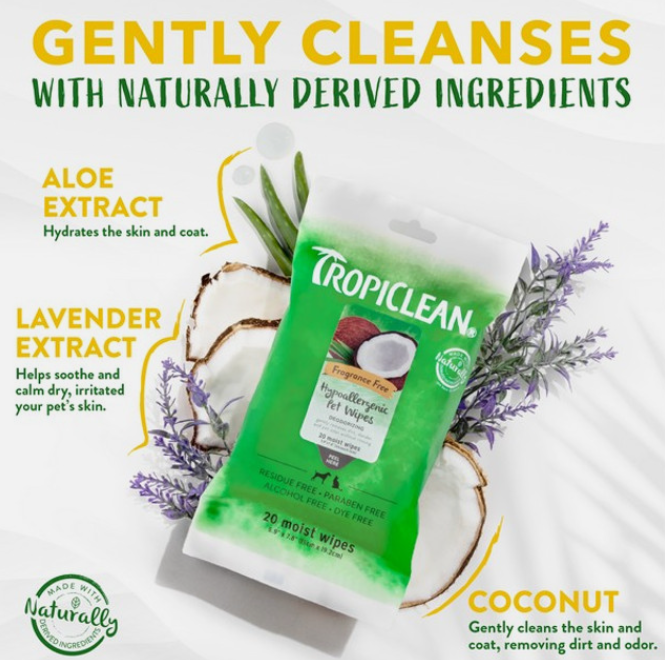 TropiClean Fragrance Free Hypoallergenic deodourising Bath Wipes are mild enough for puppies, kittens and pets with allergies and sensitive skin. Our mild coconut cleanser gently lifts away dirt, drool and more from dog and cat paws, face, body and butt, leaving them fresh and ready for cuddles.