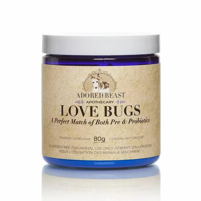 Love Bugs by Adored Beast combines both prebiotics and probiotics in one formula. It features a 14-strain probiotic blend delivering 30 billion allergen-free CFU alongside the prebiotic Larch Arabinogalactin. These beneficial bacteria support your pet’s digestive health and immune system. Love Bugs may also promote dental, ear, and skin health, and is suitable for puppies from 12 weeks old. For best results, add the recommended daily amount to your pet’s food, adjusting by weight. Store in the original pouch inside the tub to maintain freshness, and refrigerate after opening. Always start with a lower dose and increase gradually.
