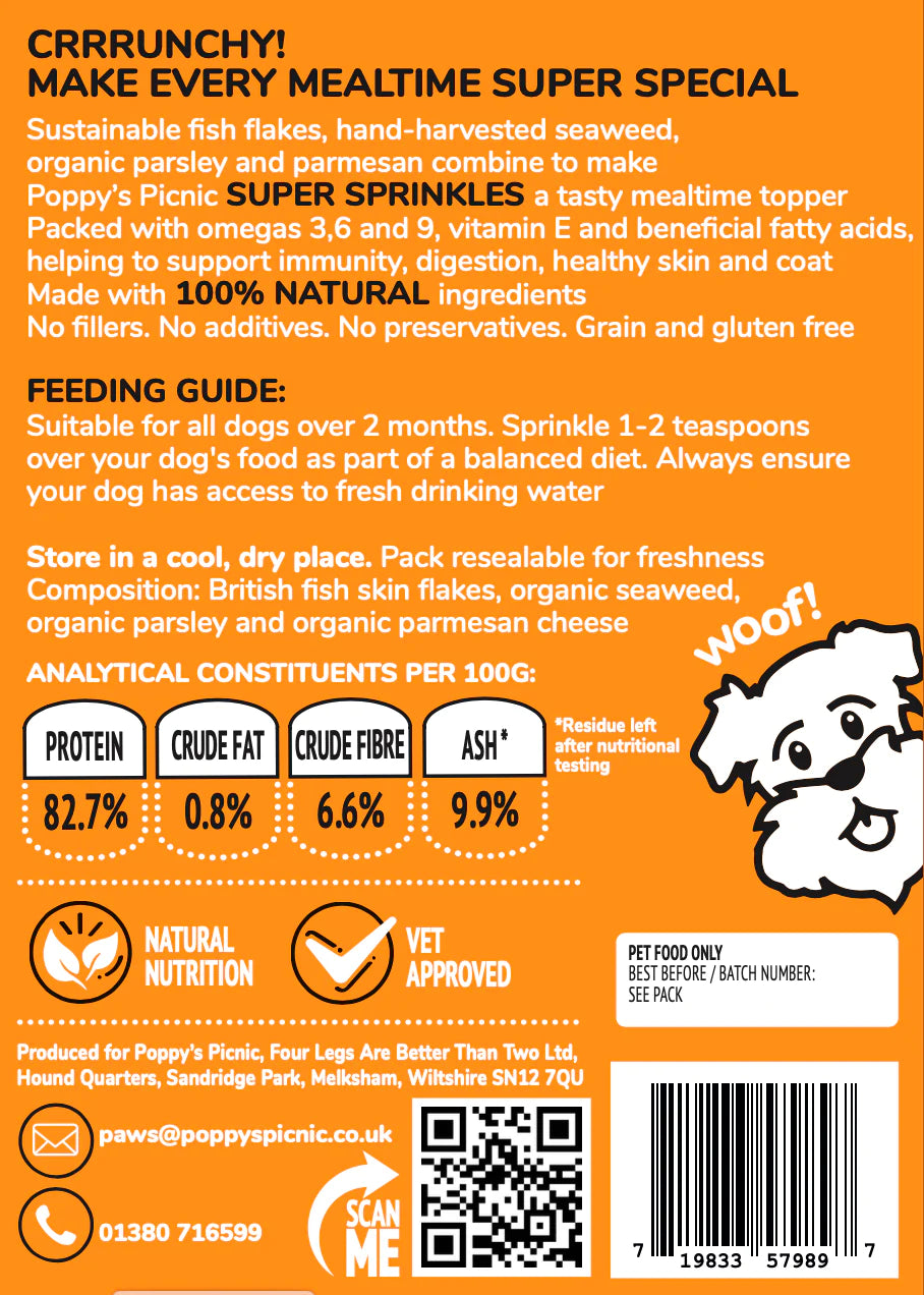 Not only will the tasty sprinkles get their taste buds singing (you can add to any food raw, dry or canned), they are an ideal source of nutrients for your dog.