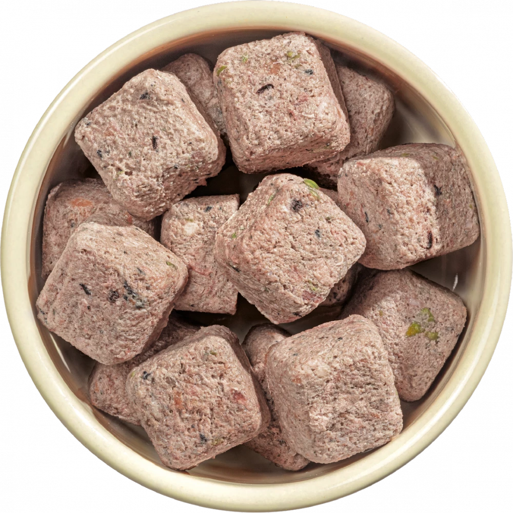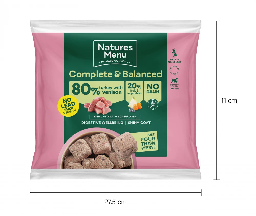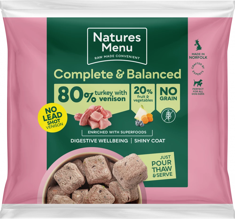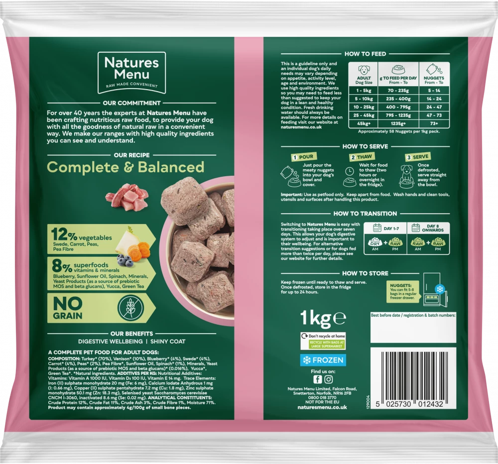 It’s been our commitment for over 40 years to provide your dog with all the goodness of natural raw food in a convenient way. That’s why our Turkey with Venison nuggets can just be counted into a bowl, thawed and served.