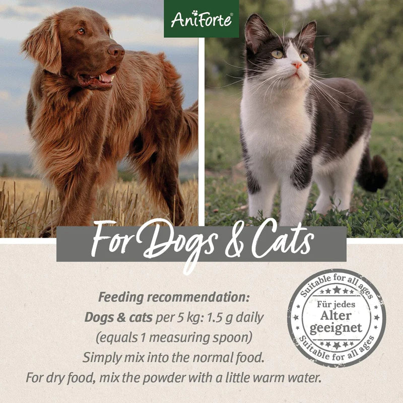 AniForte® Bovine Blood Powder is recommended for the daily diet of dogs and cats with fresh meat (BARF), canned meat or cooked food to enhances any meal.