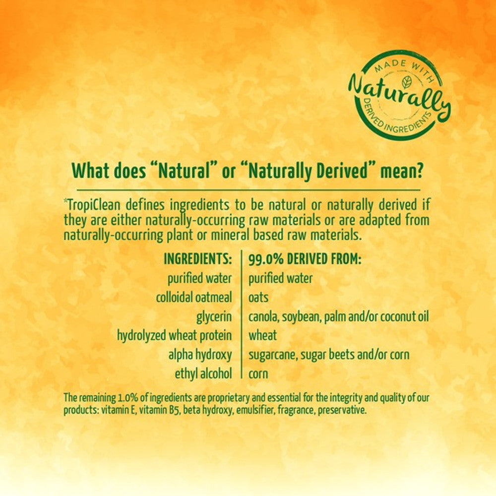 Naturally-Derived Ingredients — TropiClean defines ingredients to be naturally derived if they are either naturally-occurring raw materials or are adapted from naturally-occurring plant or mineral based raw materials.