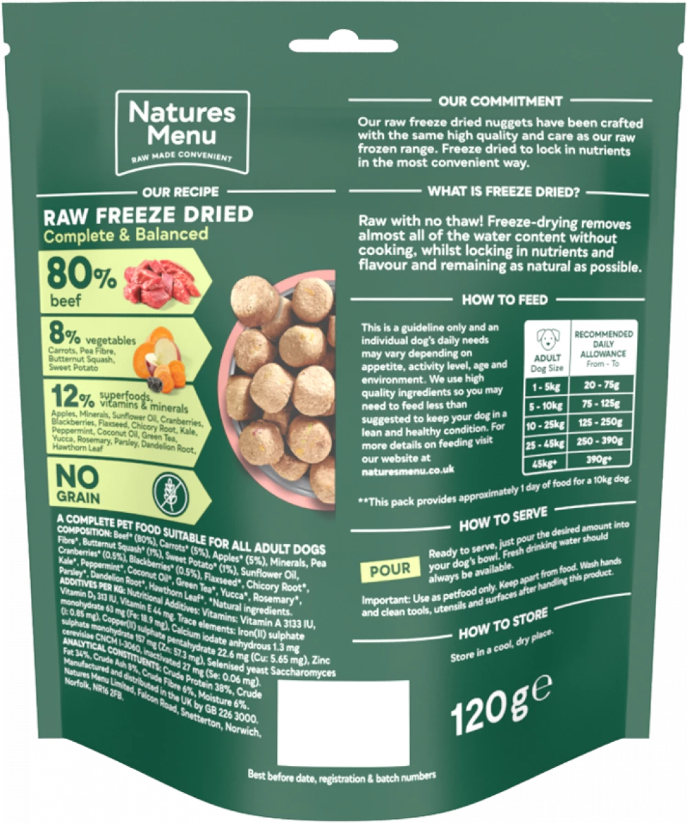 There’s also the peace of mind that all our complete and balanced meals for dogs are made to FEDIAF nutritional guidelines, crafted by our expert team for worry-free natural feeding and mess free mealtimes. Our Freeze Dried nuggets make a delicious meal for all adult dogs.