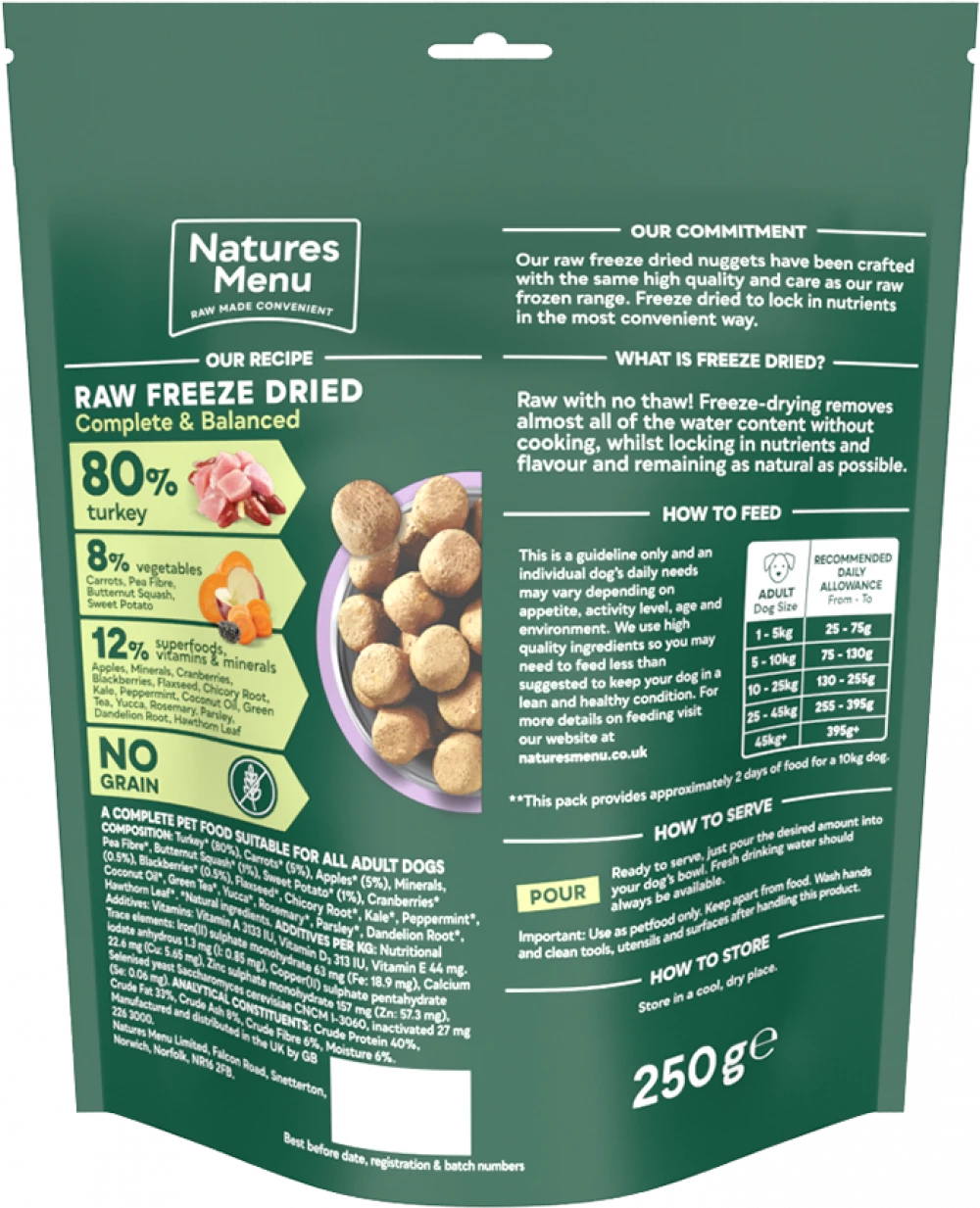 There’s also the peace of mind that all our complete and balanced meals for dogs are made to FEDIAF nutritional guidelines, crafted by our expert team for worry-free natural feeding and mess free mealtimes. Our Freeze Dried nuggets make a delicious meal for all adult dogs.