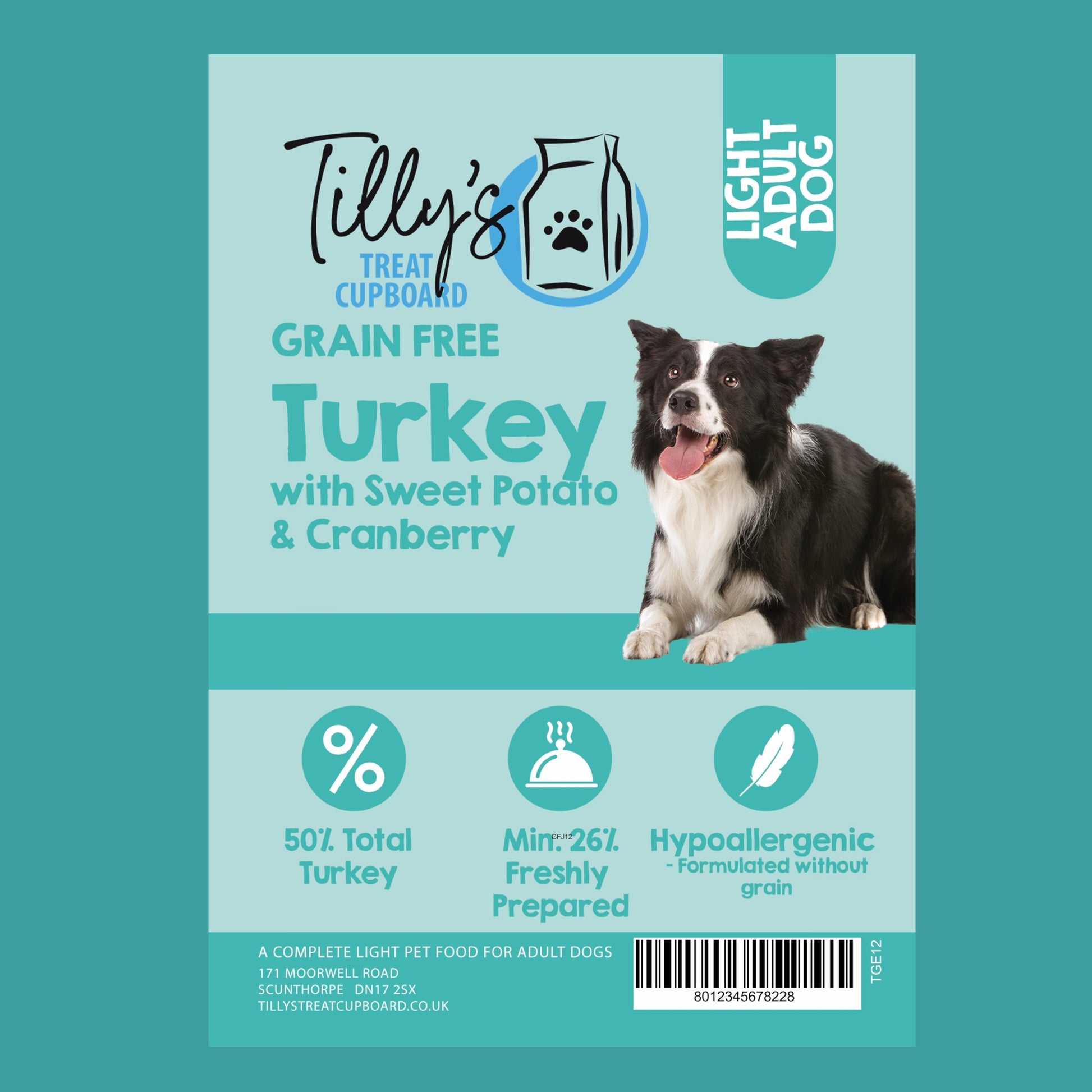 Tilly's Brown Bag ADULT DOG LIGHT Turkey with Sweet Potato & Cranberry features carefully cooked fresh turkey at a controlled 82°C to preserve protein quality, improve digestibility, and enhance taste.
