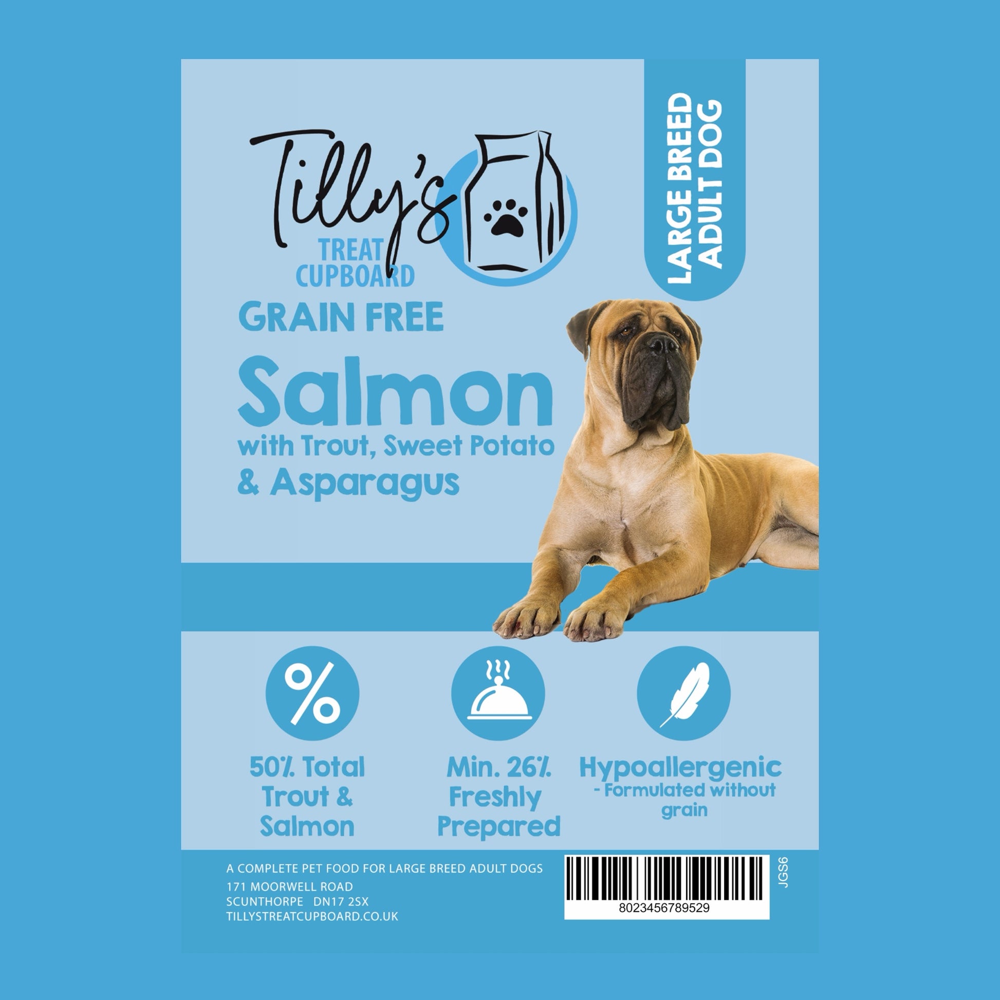 Tilly's Brown Bag LARGE BREED ADULT Dog Salmon with Trout, Sweet Potato and Asparagus features freshly prepared salmon and trout gently cooked at 82°C to preserve protein quality, enhance digestibility, and intensify flavour.