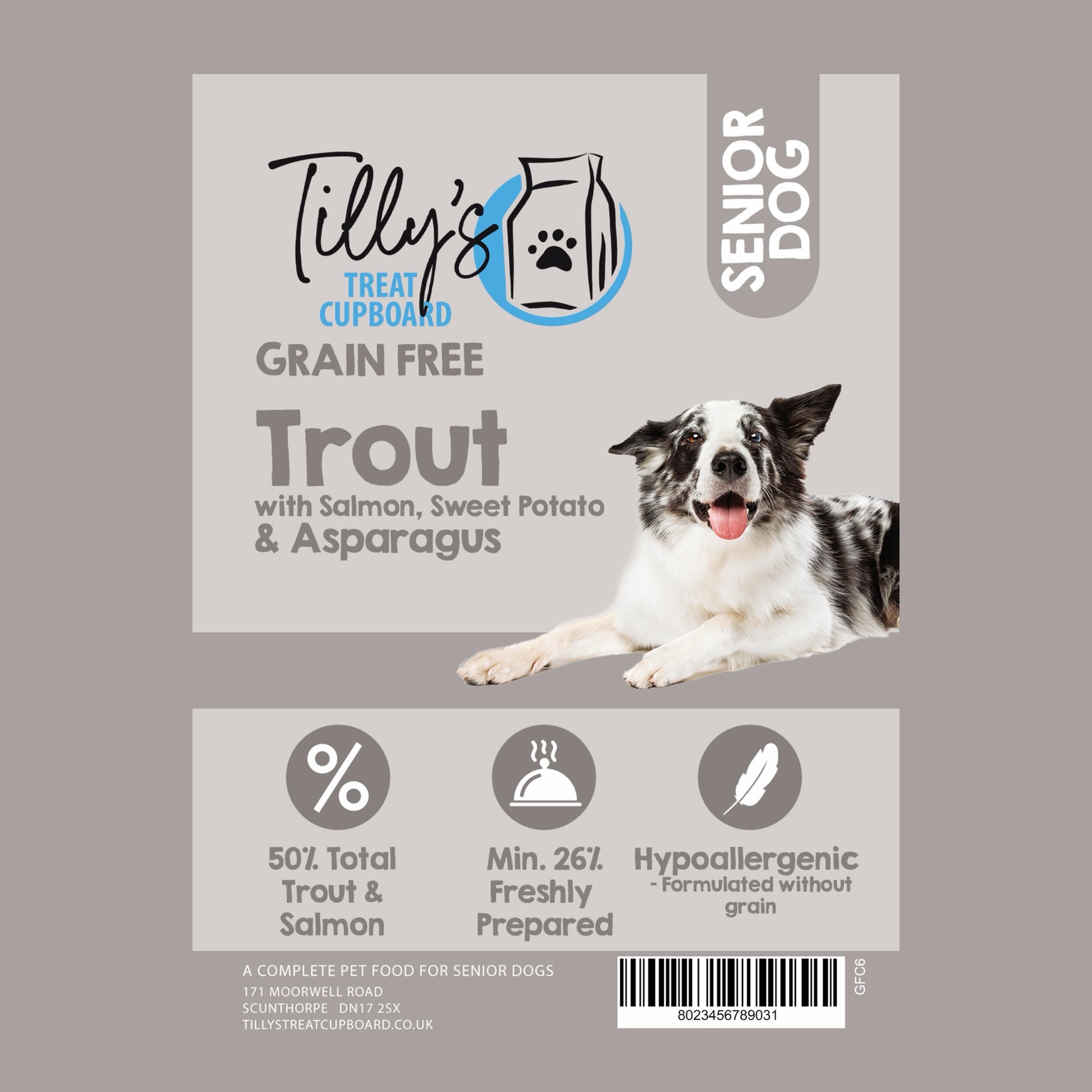 Tilly's Brown Bag SENIOR Trout with Salmon, Sweet Potato & Asparagus features freshly prepared trout gently cooked at 82°C to preserve protein quality, enhance digestibility, and intensify flavour.