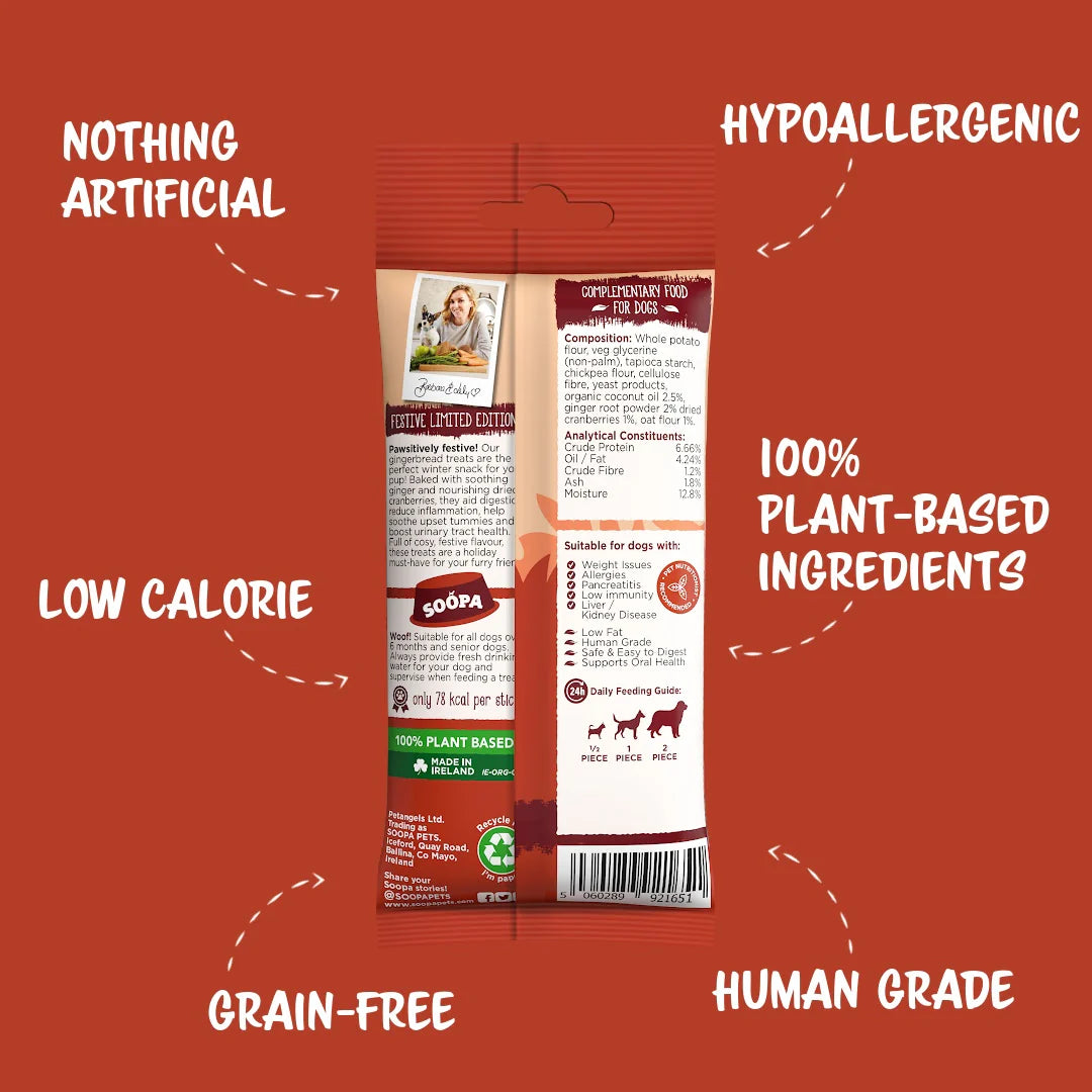 Pawsitively Festive! Our Gingerbread treats are the perfect winter snack for your pup! Baked with soothing ginger and nourishing cranberries they aid digestion, reduce inflammation, help soothe upset tummies and boost urinary tract health. Full of cosy, festive flavour, these treats are a holiday must-have for your furry friend!