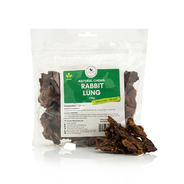 Our Rabbit Lung is made from pieces of rabbit lung, puffed up using hot air into a soft, chewy treat for your dog. This method of preparation retains all of the nutrients found within the raw lung, whilst the soft texture and low fat status makes it a great choice for puppies and elderly dogs. These treats are a rich source of protein, vitamins and minerals, making them a healthy snack.