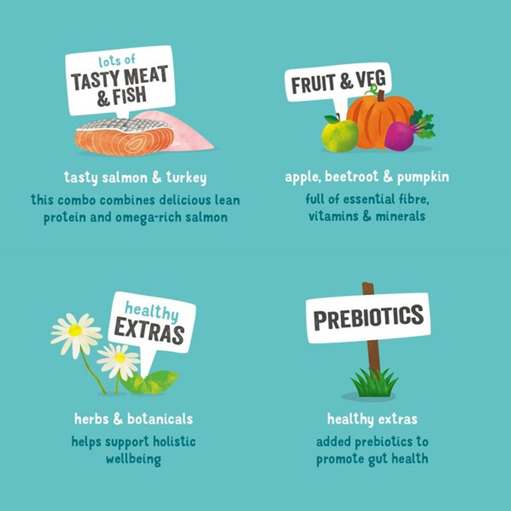 This recipe is rich in fresh salmon and Turkey, EASY-TO-DIGEST HIGH QUALITY PROTEINS and Omega 3s that support HEALTHY MUSCLES and a silky soft coat. Our recipes also include a balanced mix of fruits and vegetables, plus herbs and botanicals which are naturally nutritious. In this recipe, PEAS, PUMPKIN and SPINACH provide FIBER, VITAMINS A, B6, C, E, essential ANTIOXIDANTS, POTASSIUM, MAGNESIUM, CALCIUM and Omega-3 and 6