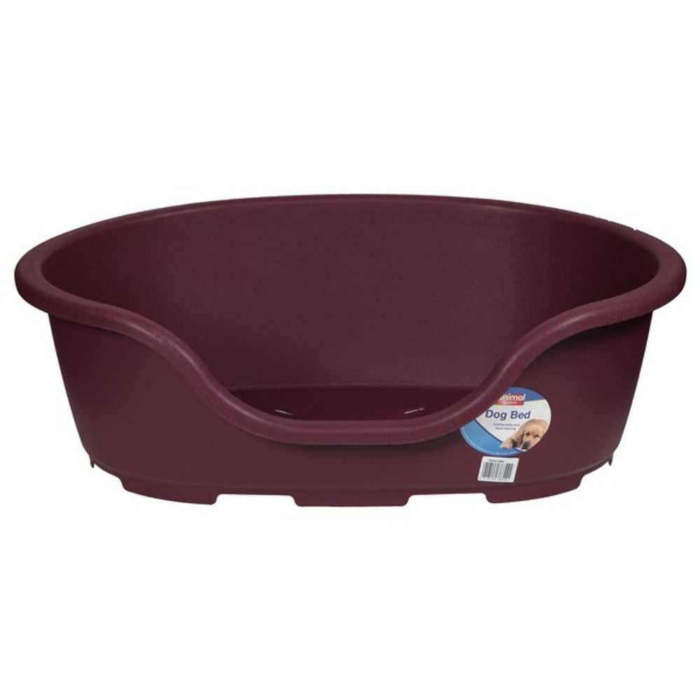 Robust, high sided plastic dog bed with a dropped front for easy access. Ventilation holes in the base