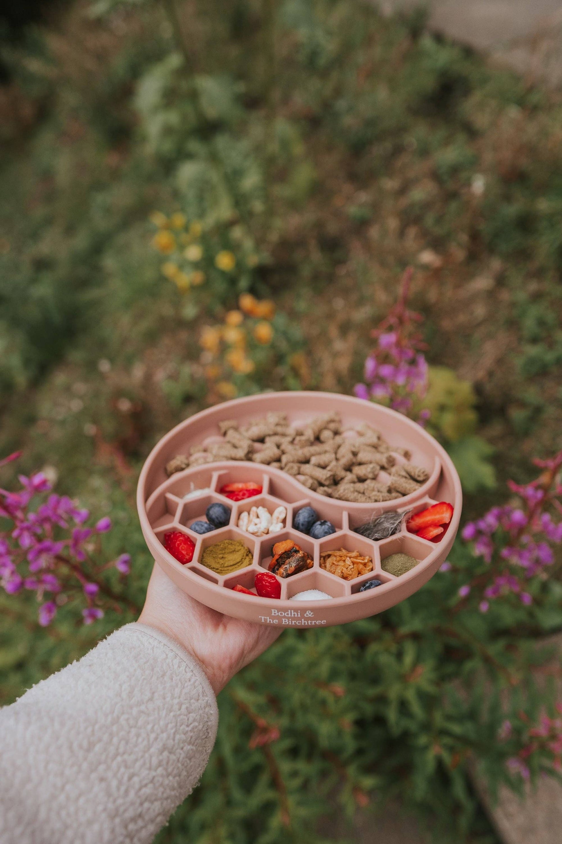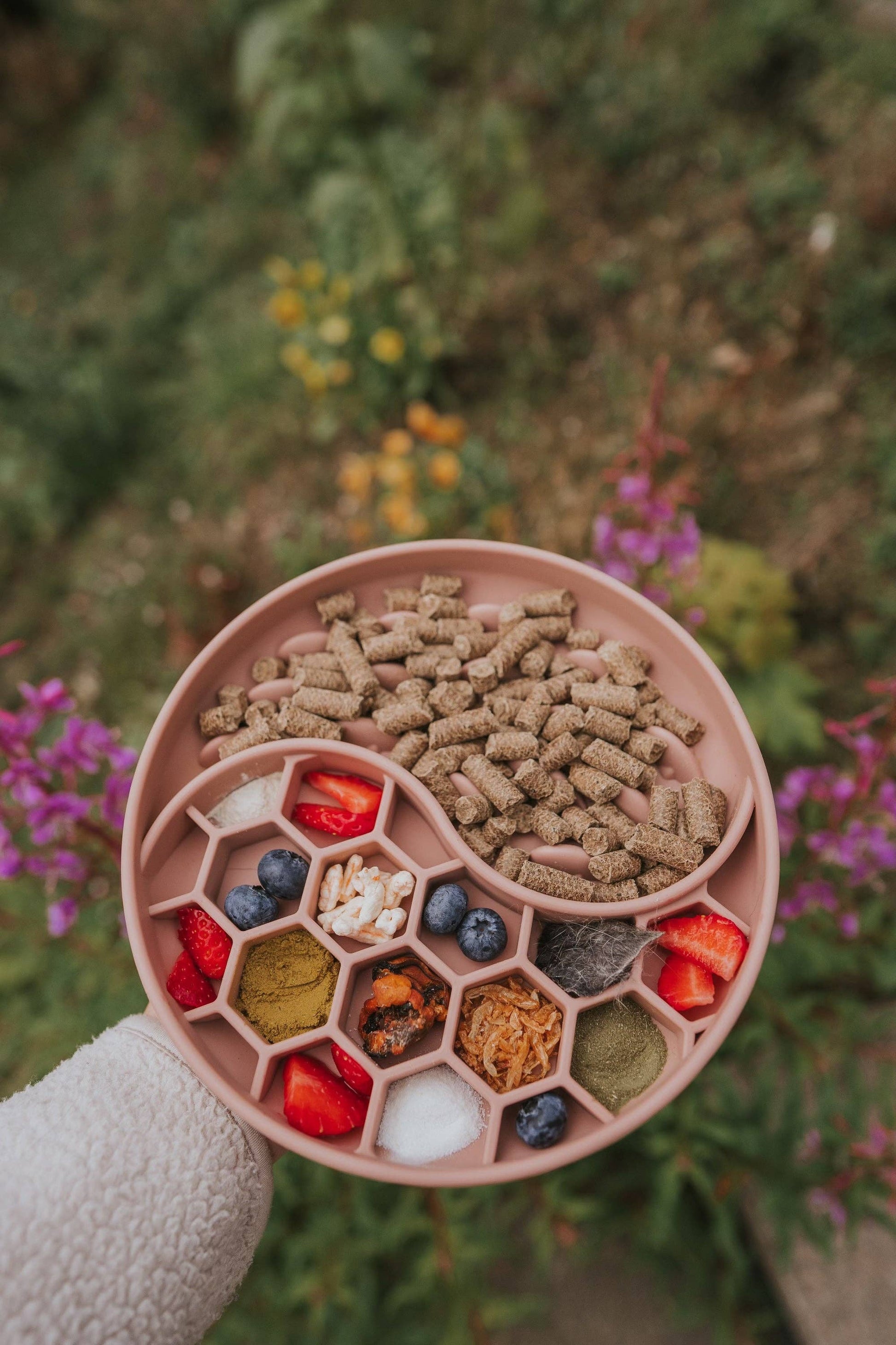 Our HoneyComb Slow Feeder Bowls are ideal for a variety of different foods. The deep honeycomb pockets are great for stuffing either raw or dry kibble into, and the whale lick mat design is great for smearing wet food/raw or pouring bone broth onto.