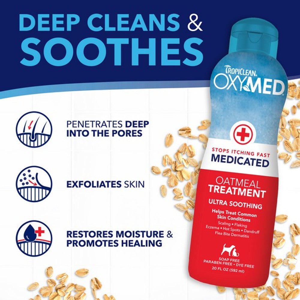 OxyMed Medicated Oatmeal Treatment contains a powerful combination of alpha hydroxy, beta hydroxy, and omega-3 & -6 fatty acids that helps penetrate deep into the pores, exfoliating the skin to help restore moisture. The nourishing oatmeal conditioner contains vitamins, chamomile, and aloe to condition the skin and coat and provide ultra-soothing relief.